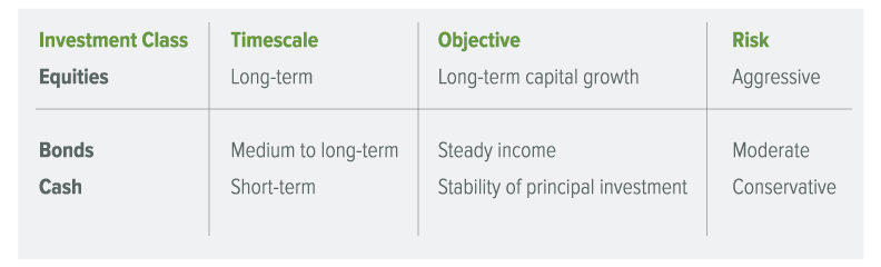 Having thought about the various risks your investment may be exposed to, you next need to become familiar with the major types of investment, or asset classes.